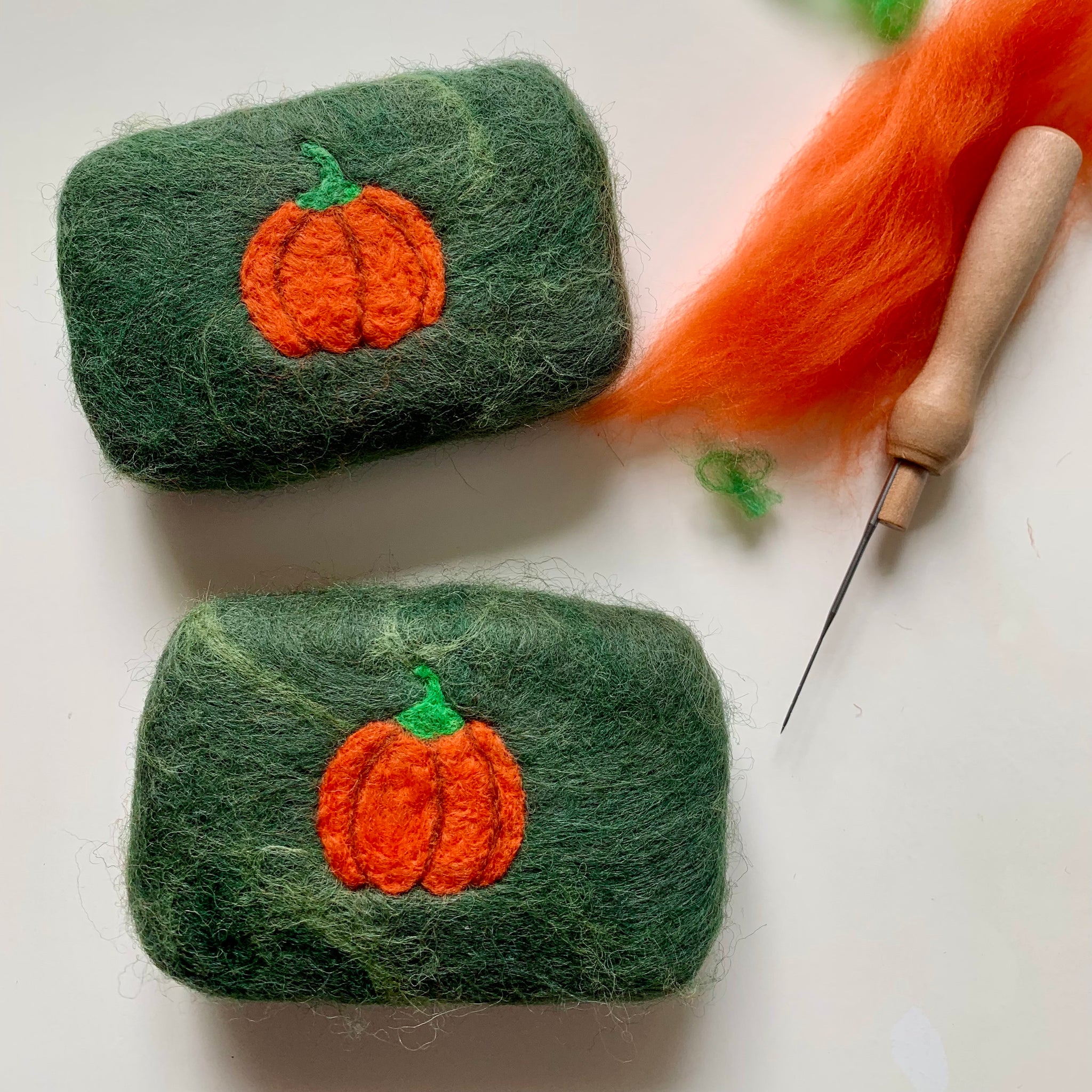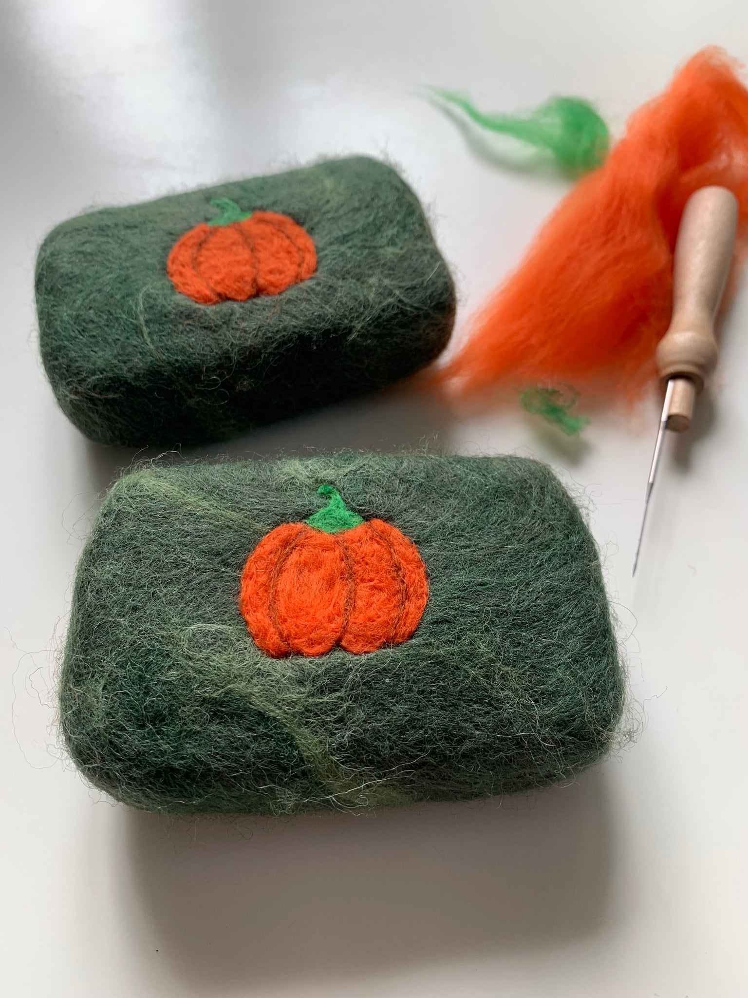 Traditional cold process soap, made with Shea Butter, Coconut Oil, Castor Oil, Sunflower Oil, Essential Oils and felted with green sheep wool and a Pumpkin design.