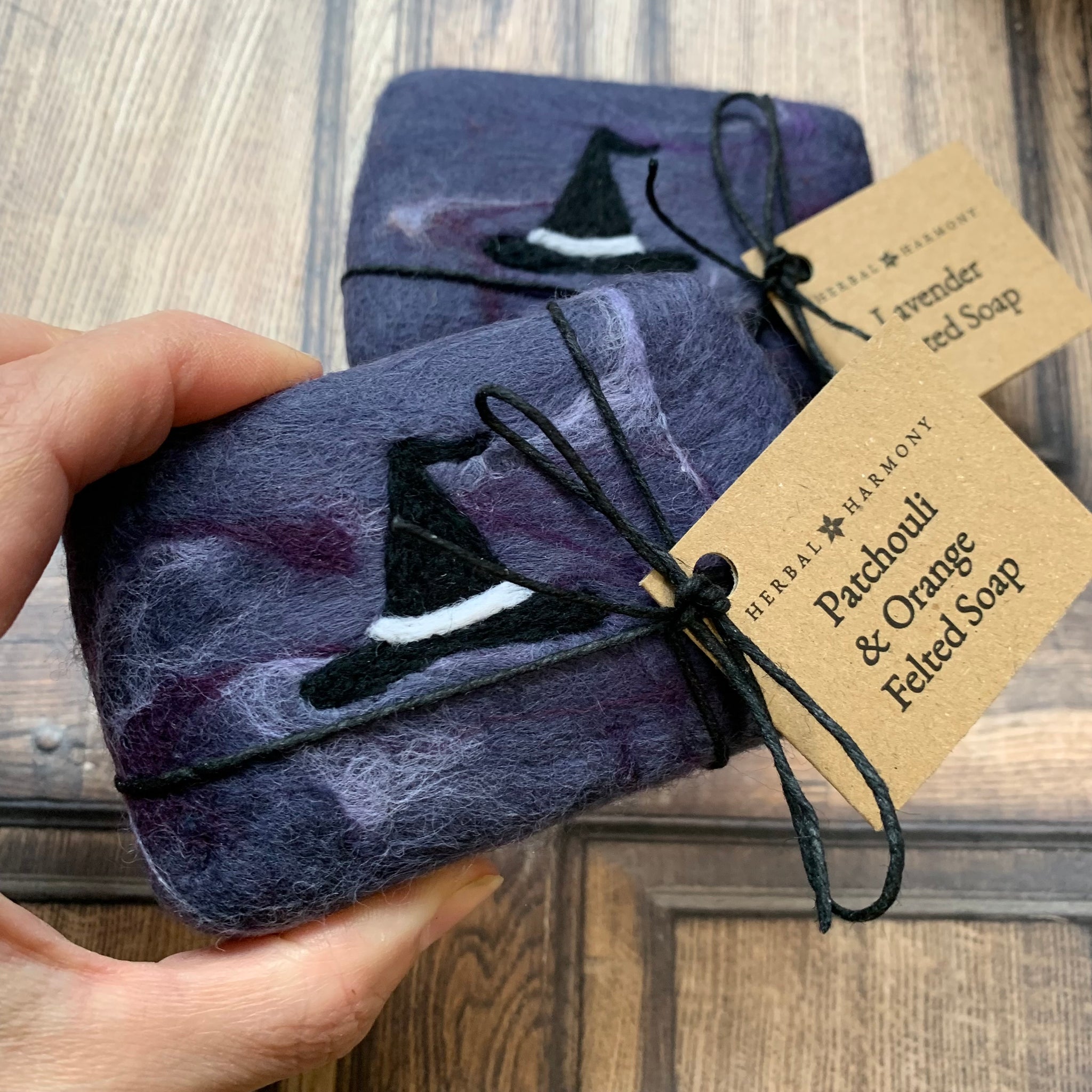 Handmade cold process Soap, made with Shea Butter, Coconut Oil, Castor Oil, Sunflower Oil, Essential Oils and felted with purple merino wool and a Witch Hat design.