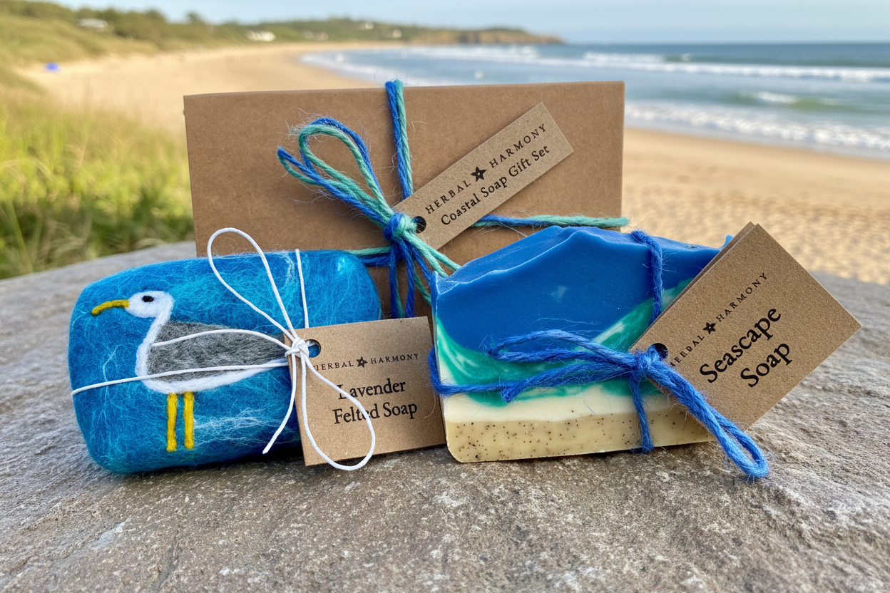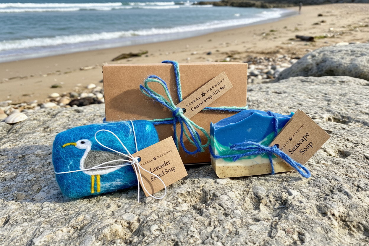 The Coastal Soaps Gift Set includes 2 ocean themed soaps in a eco friendly Kraft brown gift box, tied with blue and turquoise jute string.