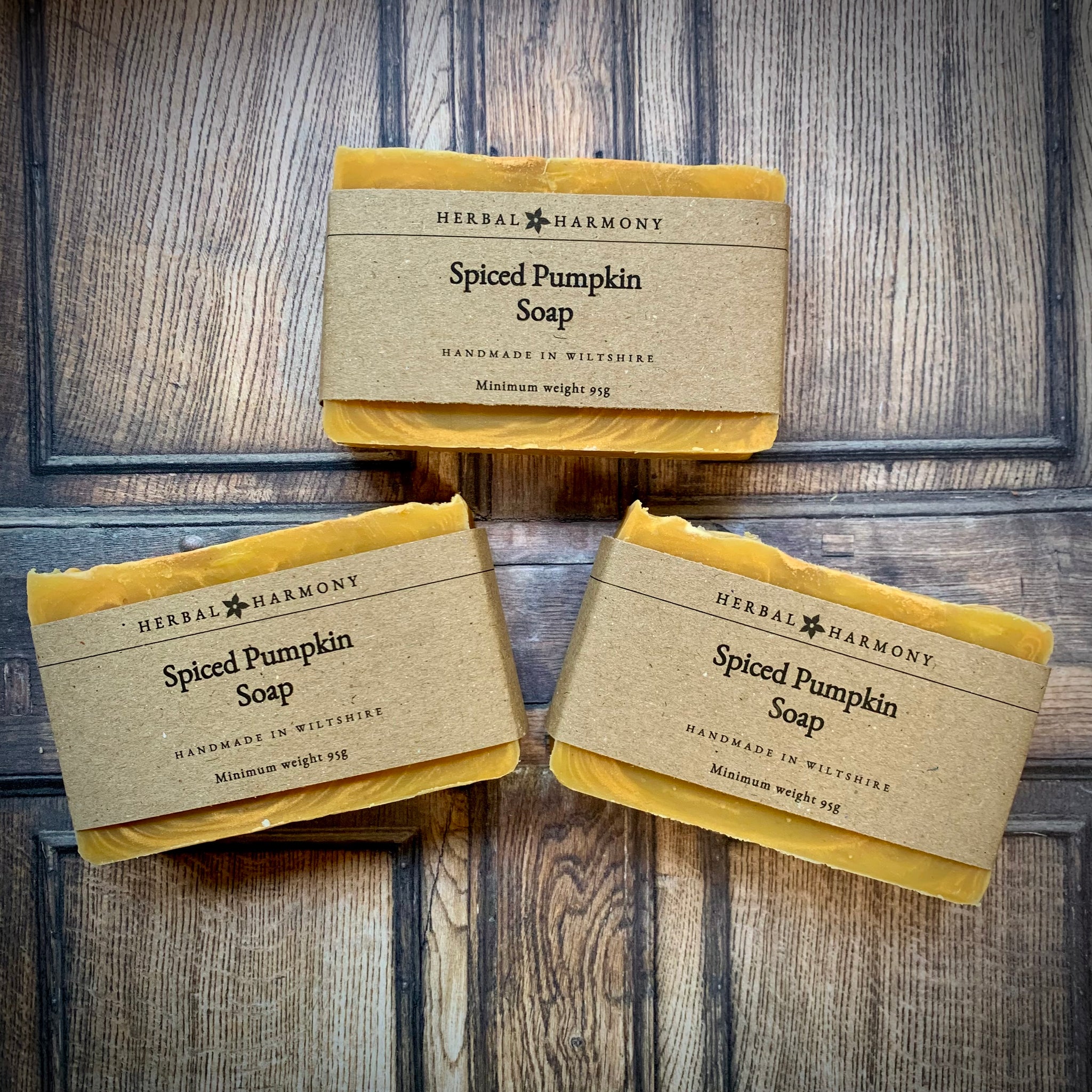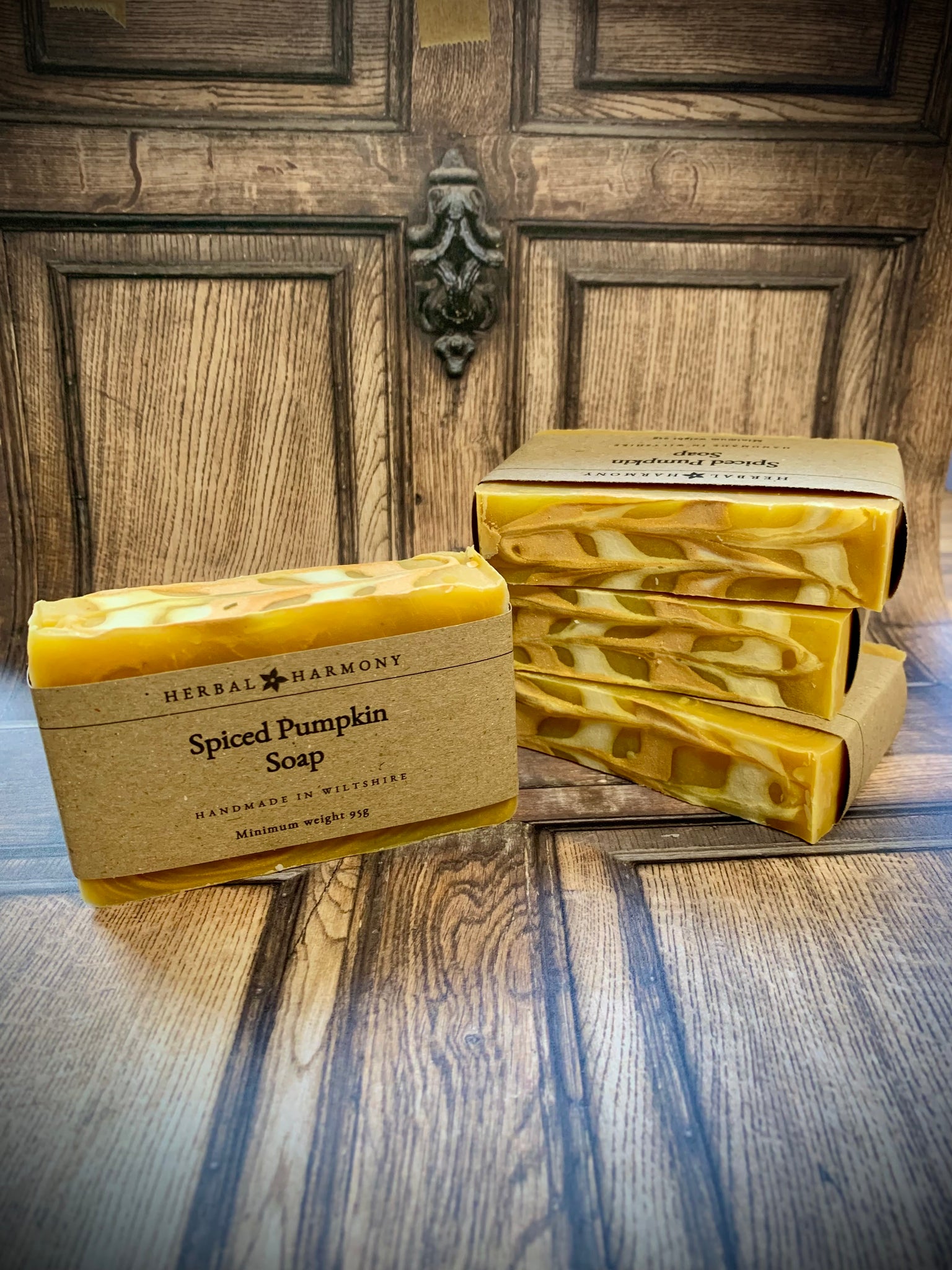 Traditional cold process Spiced Pumpkin soap, made with Shea Butter, Coconut Oil, Castor Oil, Sunflower Oil, Pumkpin puree, Orange, Clove & Nutmeg Essential Oils and gold mica.